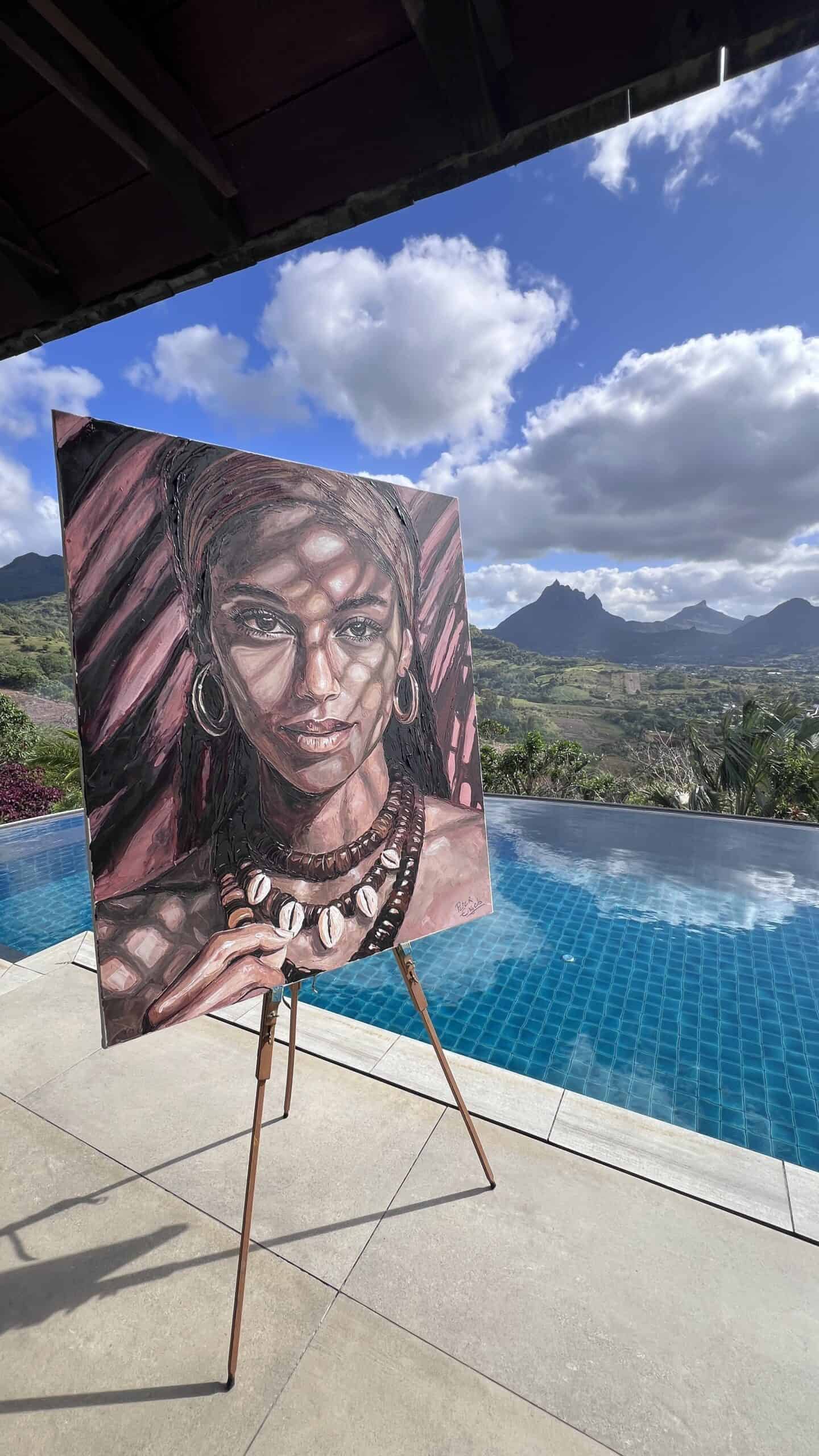 The painting reflects the melting pot of tropical cultures that defines Mauritius, its people, nature, and quiet strength. More than a portrait, Layla is a timeless celebration of identity and natural elegance.