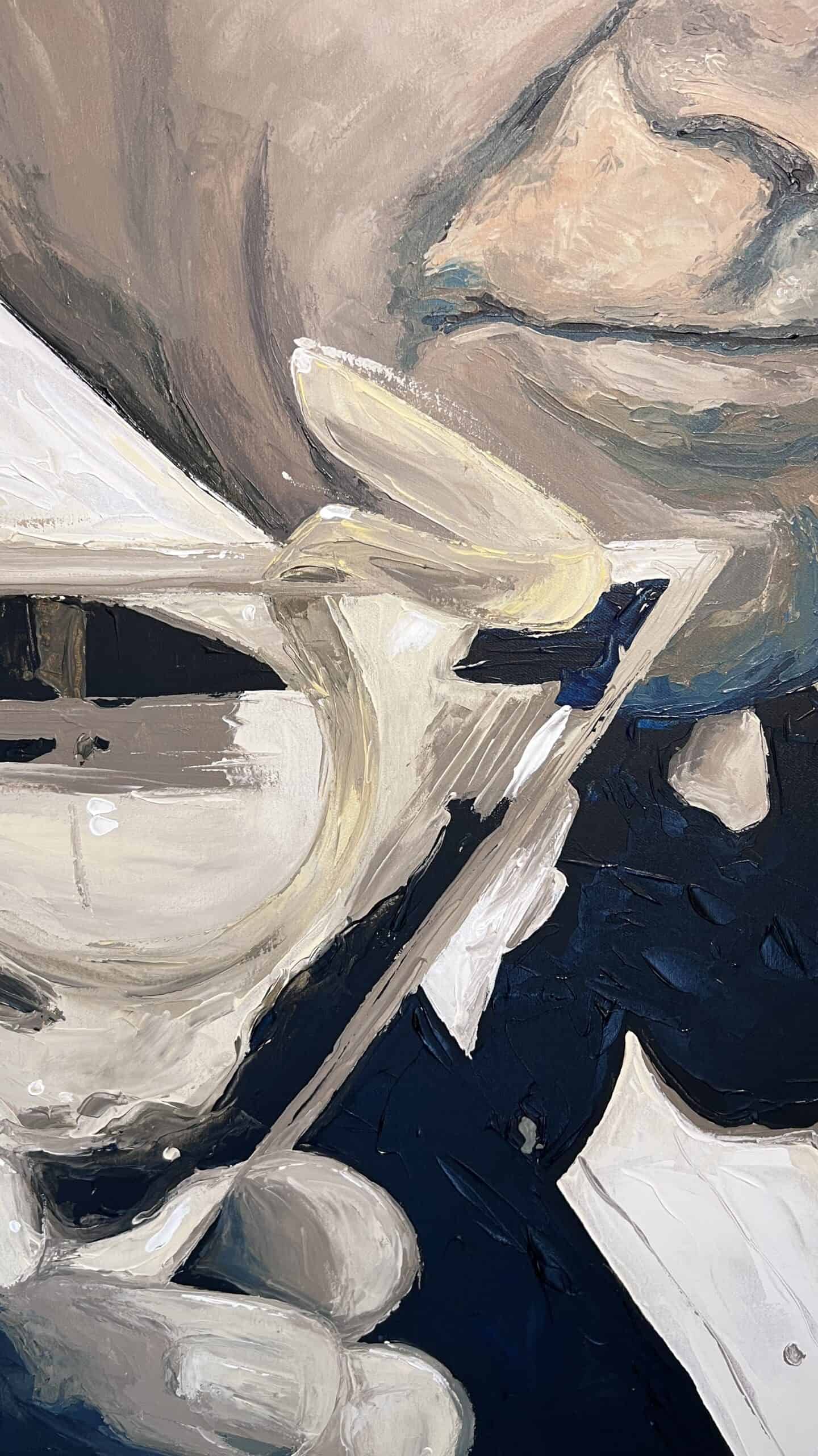 Sean Connery portrait as James Bond 007 by Peter Engels – A large 2x1m palette knife painting in sepia tones with blue shadows, featuring a vintage tuxedo toast with Vodka Martini. A true collector’s tribute.
